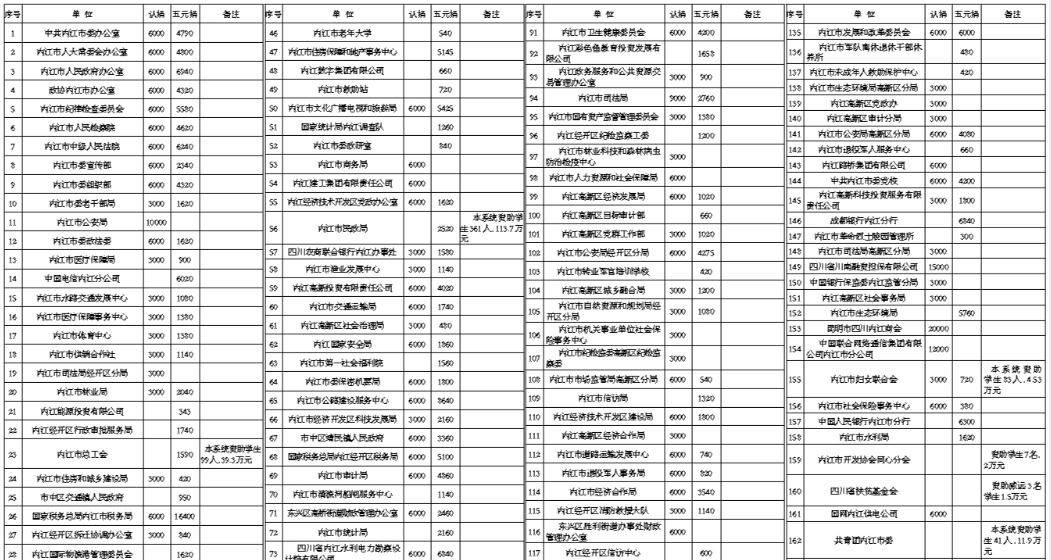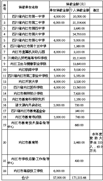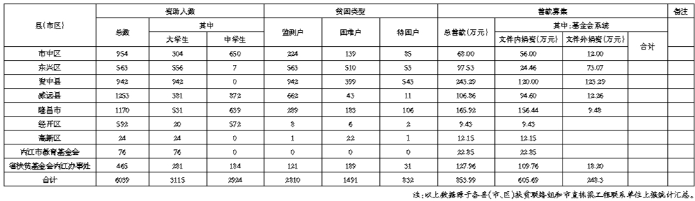 四川省扶贫基金会内江办事处 内江市栋梁工程扶贫助学管理办公室关于内江市2025年栋梁工程解困助学捐款情况公告 在中共内江市委、内江市人民政府的领导下,在四川省扶贫基金会和内江市农业农村局的指导下,根据中共内江市委办公室、内江市人民政府办公室《关于进一步做好“栋梁工程”解困助学工作的通知》(内委办发〔2021〕56号)精神,全市党政机关、社会团体、企事业单位和爱心人士积极参与、热心奉献,截至2025年10月22日,全市共筹集解困助学善款853.99万元,资助困难学生6039人。其中,资助困难大学生3115名,困难中小学生2924名。实现了因病、因残、因灾致困及事实无人抚养孤儿等学生应助尽助,帮助大批寒门学子圆梦大学和困难中小学生继续读书,为我市解困助学、人才培养和助力乡村振兴作出了积极贡献。 我们代表全体受助学生向捐资助学的党政机关、社会团体、企事业单位以及爱心人士表示衷心感谢!